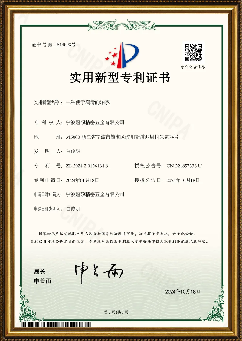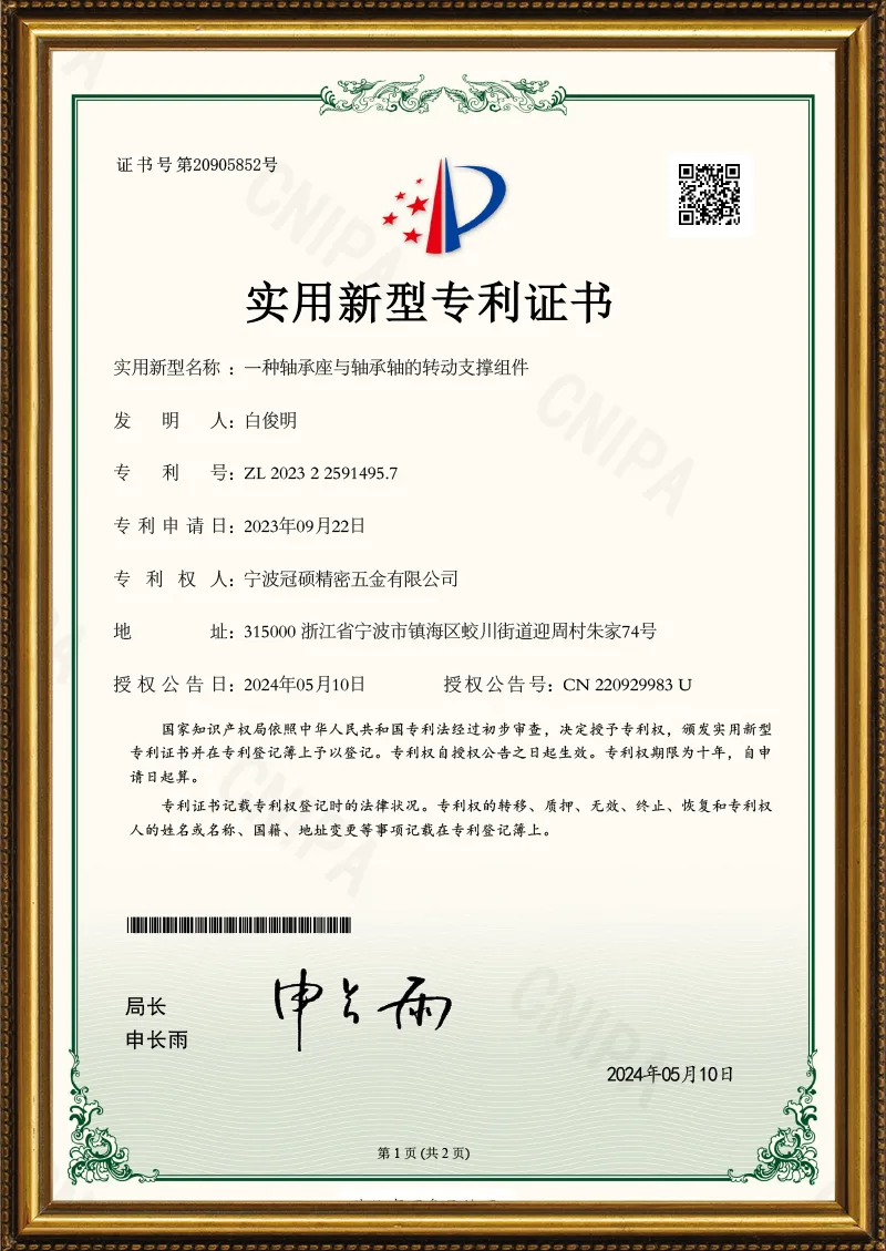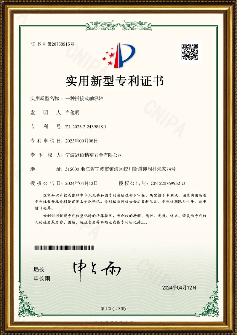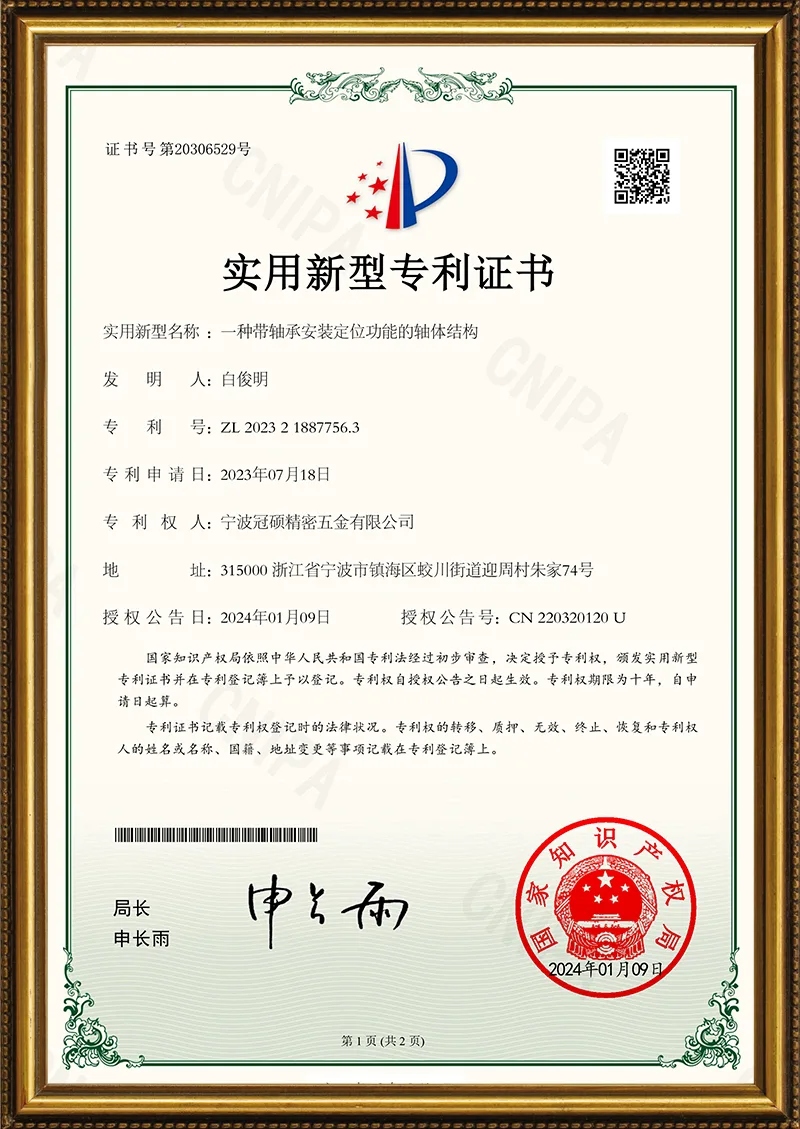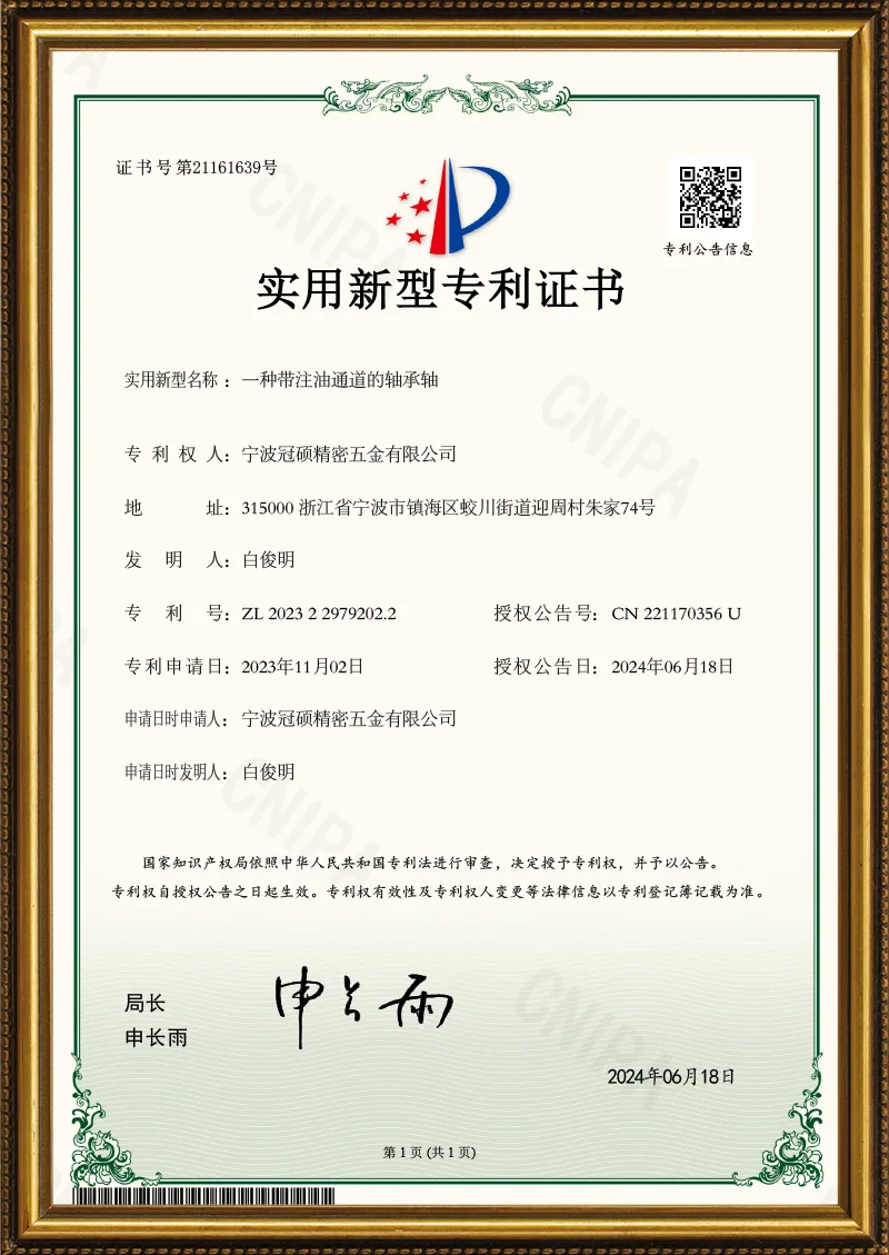 Patent certificates: A rolling bearing with a sealing structure, a bearing for easy lubrication, a combined motor shaft structure, a rotating support component for the bearing seat and bearing shaft, a spliced bearing shaft, a bearing shaft with an oil injection channel, a bearing shaft with bearing installation positioning function, an axle structure with a bearing support function, a bearing support structure, a motor fixing seat structure with good stability, a motor shaft structure with good sealing performance, a motor shaft structure for convenient assembly.